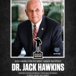 With 40 nominations (35 individuals and five programs) considered for the 2024 award, Troy University Chancellor Dr. Jack Hawkins was the 13th Armed Forces Merit Award recipient. Upon completing his bachelor’s degree in 1967 from the University of Montevallo, Dr. Hawkins was commissioned a lieutenant in the U.S. Marine Corps and served as a platoon leader during the Vietnam War. He received the Bronze Star, the Purple Heart, and a citation from the Korean Marine Corps for his combat duty.